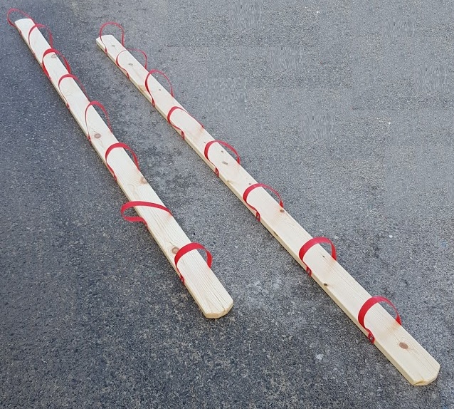 זוג מגלשי עץ הליכה עם סרטי בד לנעליים.