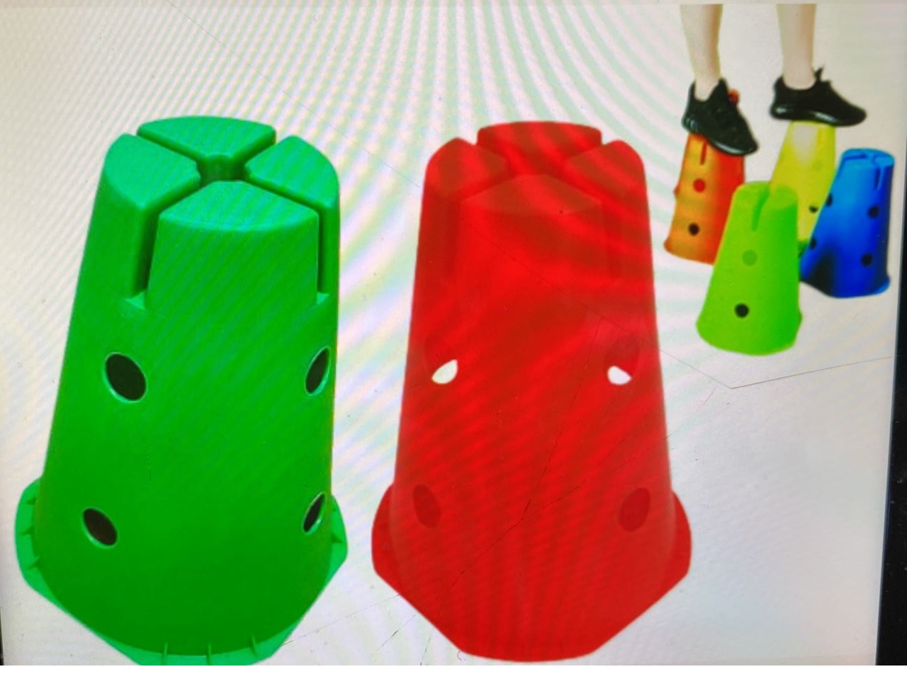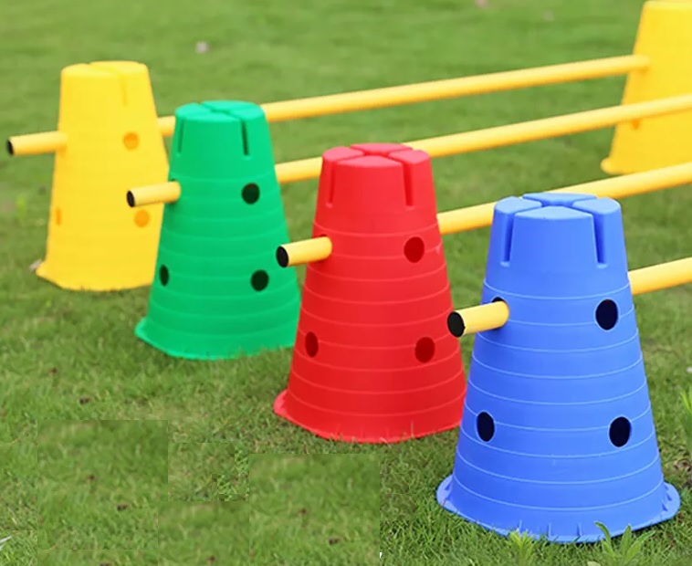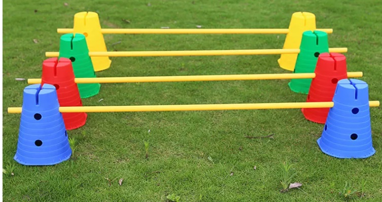 מציבים שני קונוסים זה ליד זה ומעבירים מוט פלסטי באחד מהגבהים