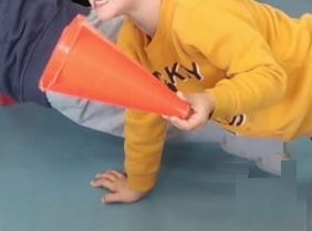 עמידת מוצא: שכיבות שמיכה אחיזת קונוס ביד אחת. החלפת אחיזה ליד השניה מבלי שהקונוס יגע ברצפה.