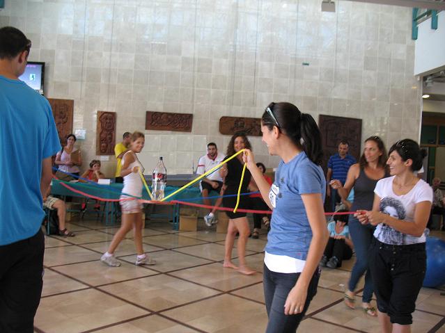. כל משתתף אוחז בקצה חבל (עד גמר הפעולה אוחז המנחה את הדסקה לייצוב)